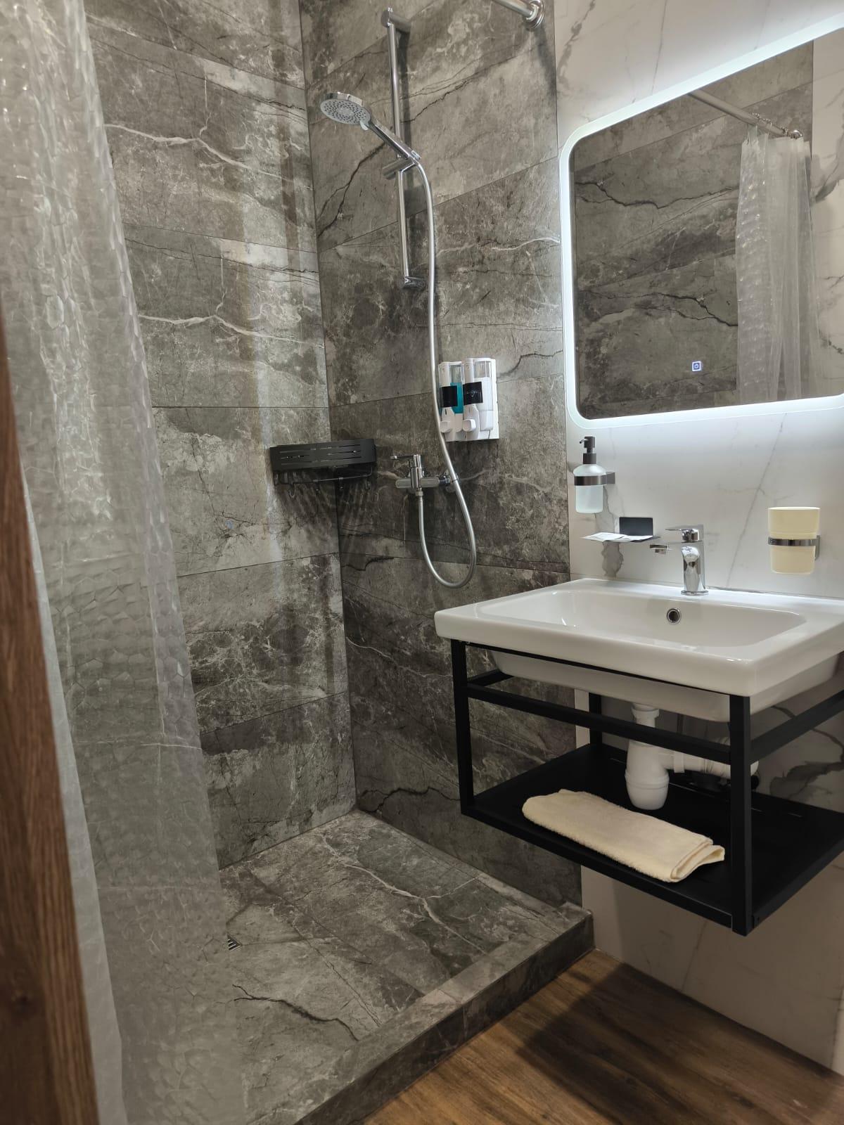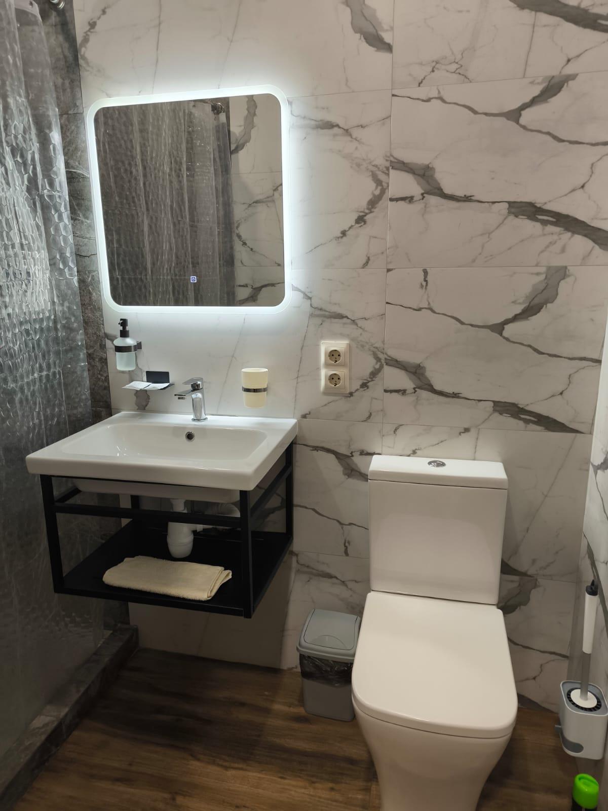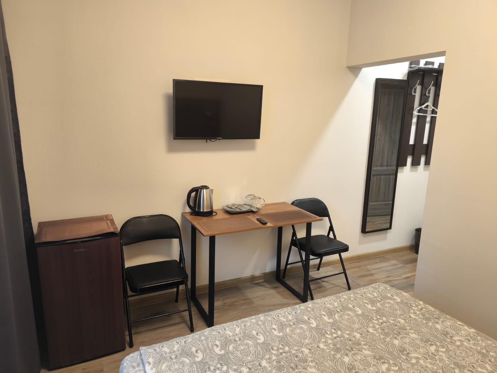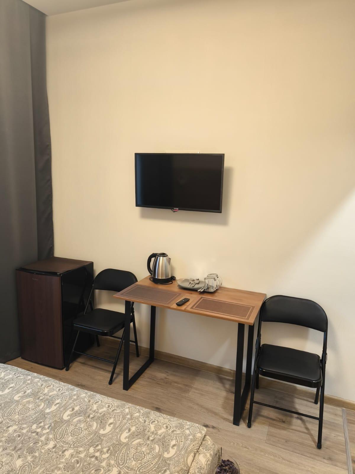 Одна большая кровать (160см) Шторы Блэк аут (99% затемнение) Звукоизоляция Потолки 3 метра Душ, умывальник, унитаз, мыло, шампунь и гель Стол и 2 стула Цифровое ТВ (Яндекс ТВ, Youtube) Wi-fi Чайник с набором посуды Холодильник Тапочки Микроволновка, Вода, Чай, Кофе в общей зоне Стирка и Глажка у администратора