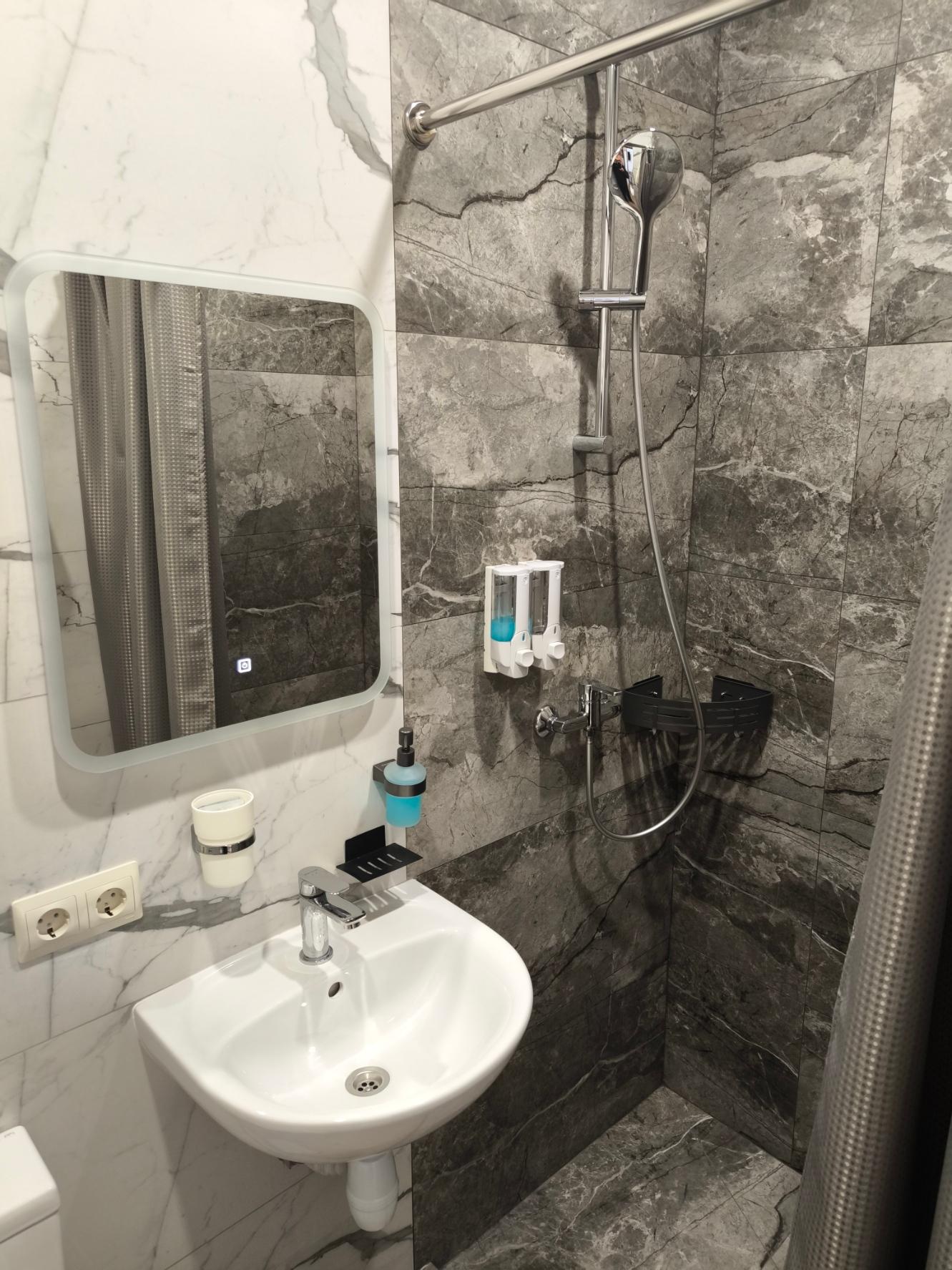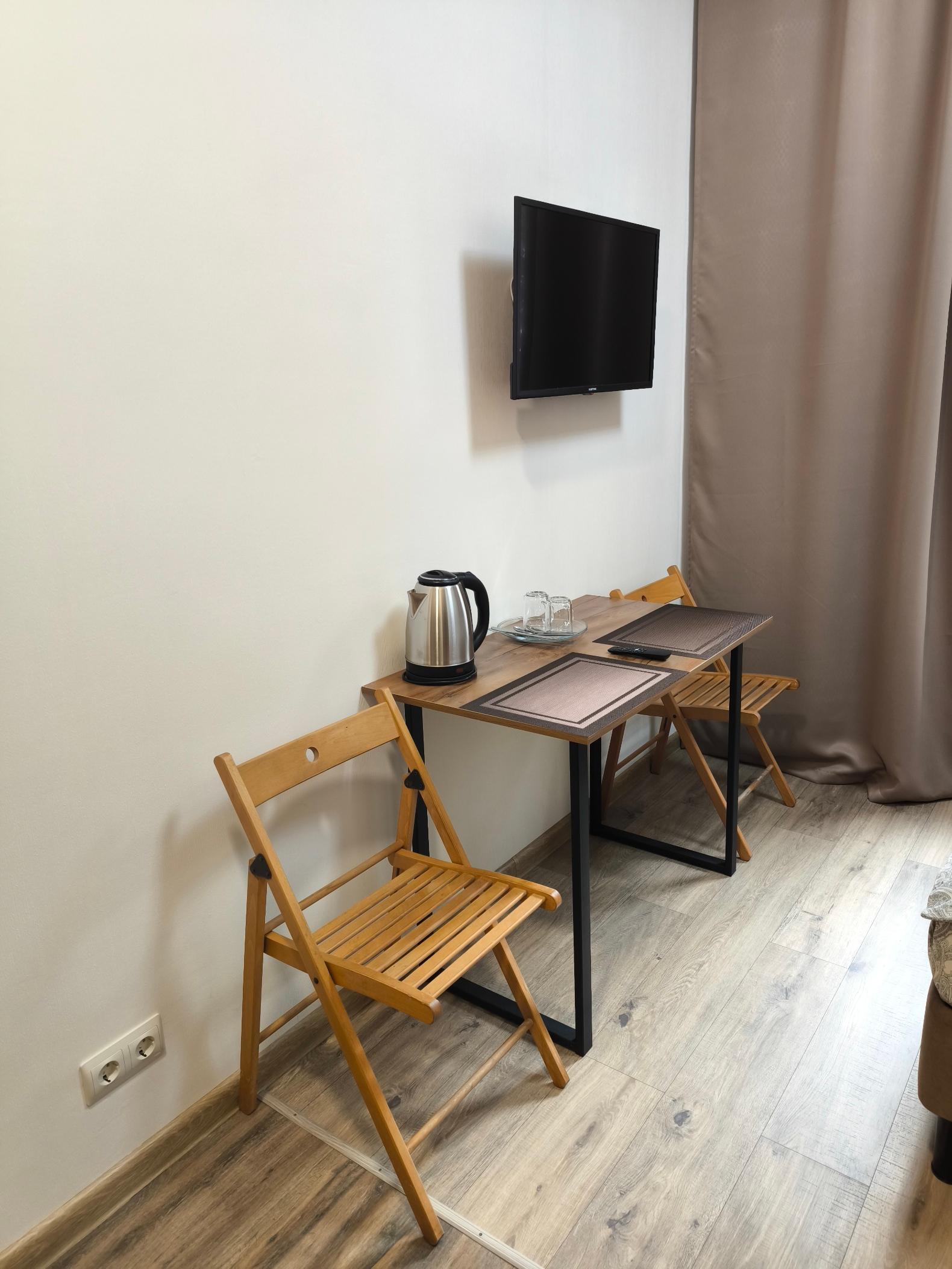 В номере две большая 140 см кровать Шторы Блэк аут (99% затемнение) Звукоизоляция Потолки 3 метра Душ, умывальник, унитаз, мыло, шампунь и гель Стол и 2 стула Цифровое ТВ (Яндекс ТВ, Youtube) Wi-fi Чайник с набором посуды Холодильник Тапочки Микроволновка, Вода, Чай, Кофе в общей зоне Стирка и Глажка у администратора