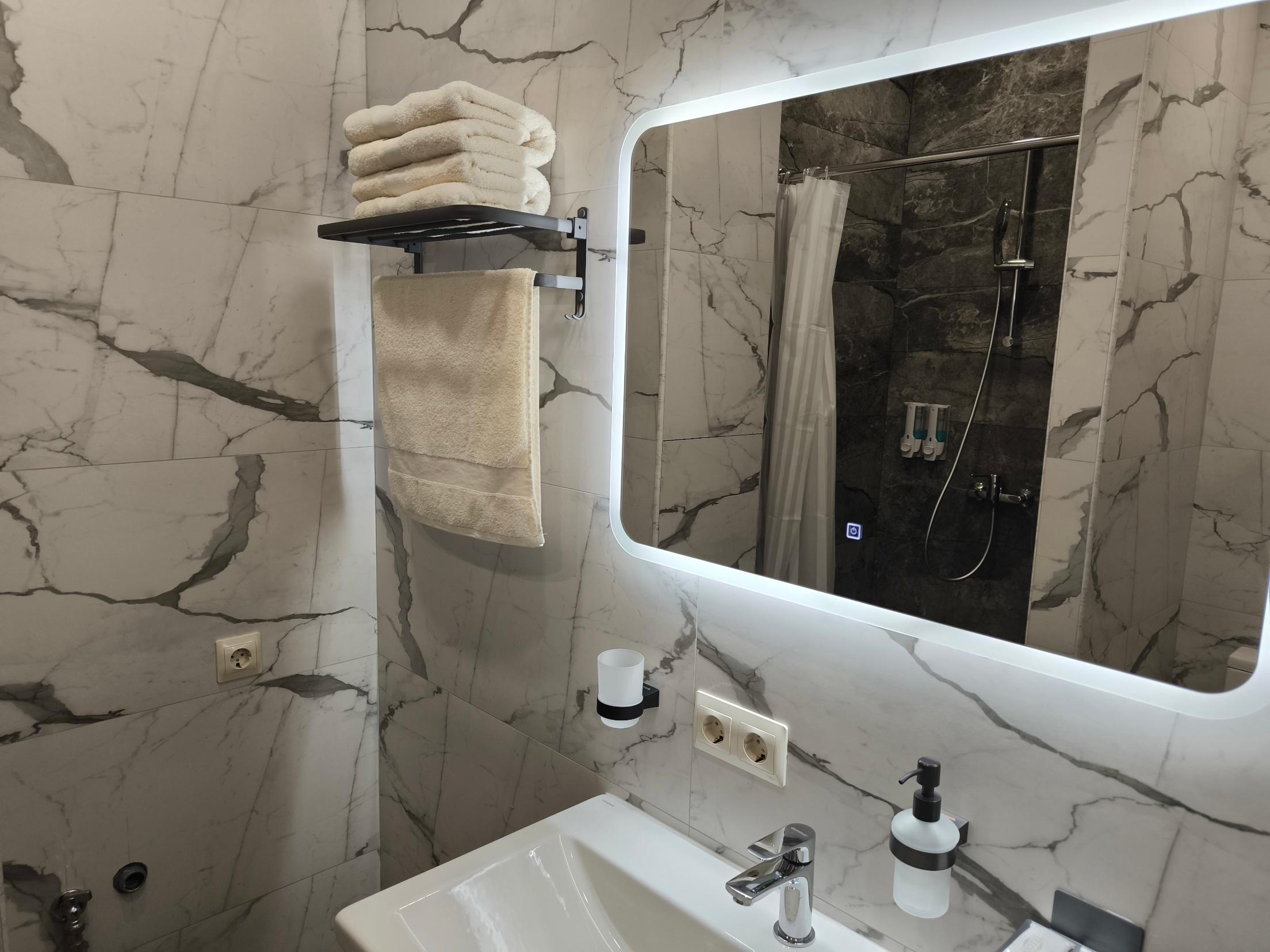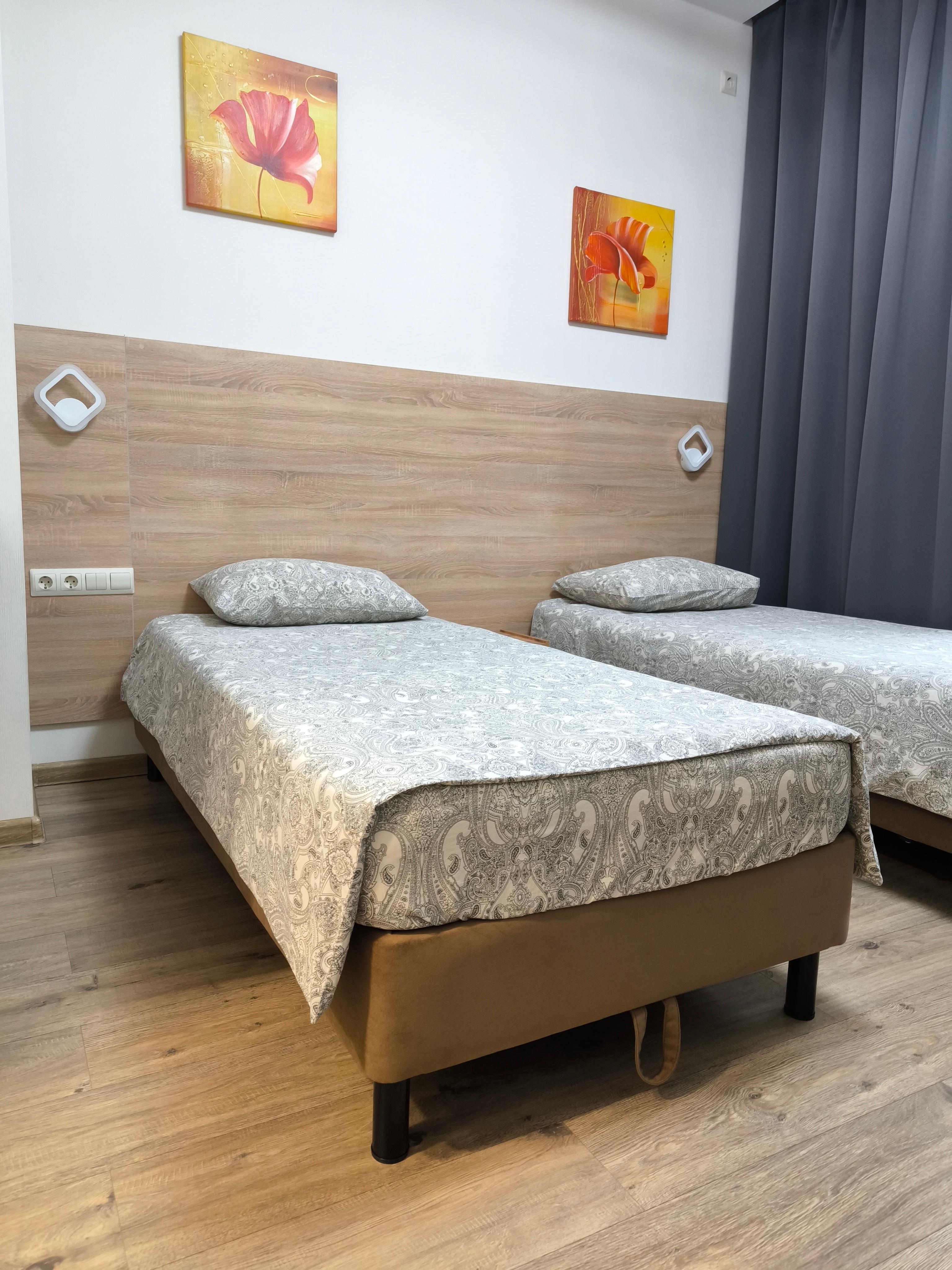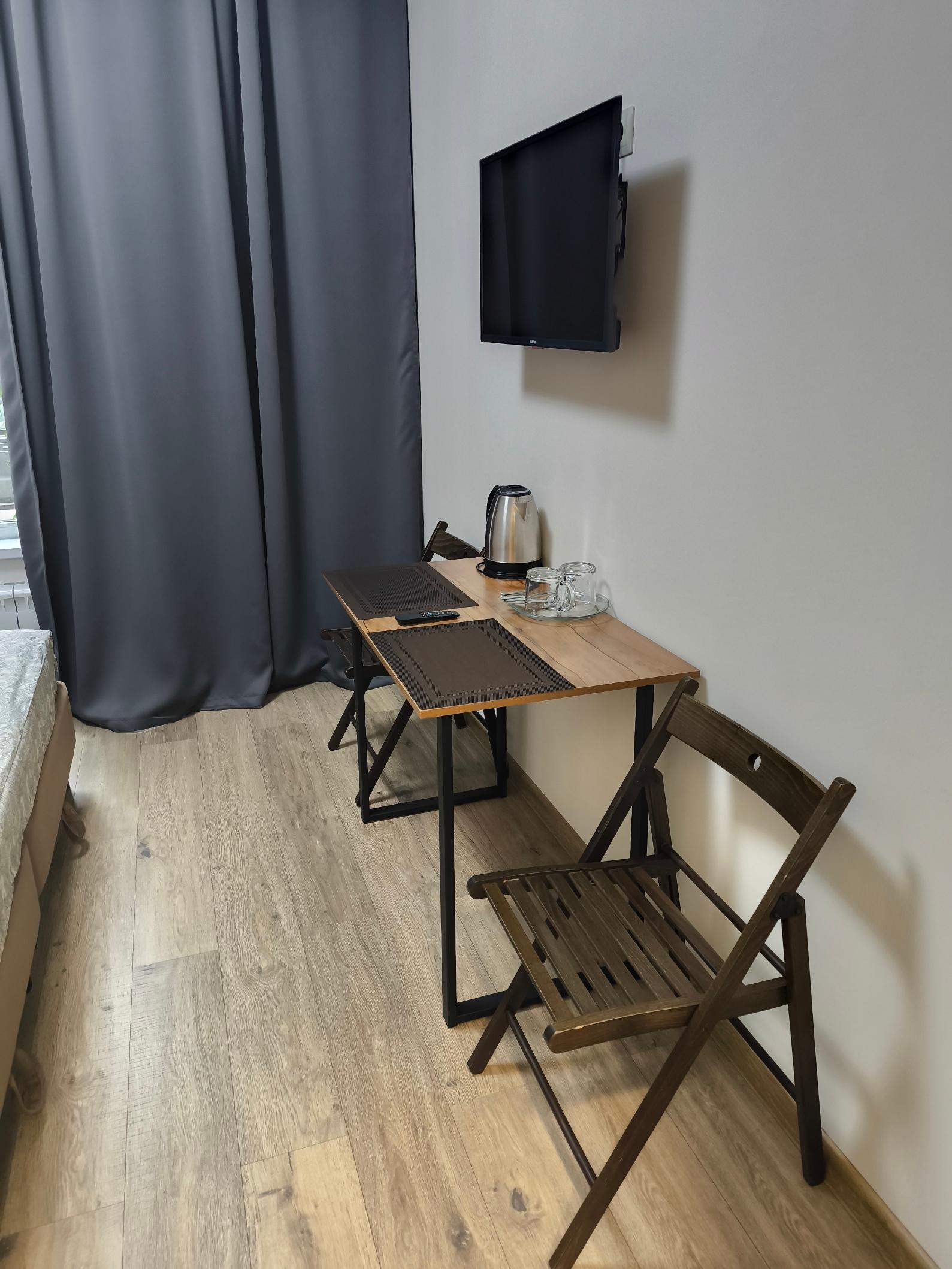 В номере по Вашему выбору: одна большая 180см или две 90-х кровати Шторы Блэк аут (99% затемнение) Звукоизоляция Потолки 3 метра Душ, умывальник, унитаз, мыло, шампунь и гель Стол и 2 стула Цифровое ТВ (Яндекс ТВ, Youtube) Wi-fi Чайник с набором посуды Холодильник Тапочки Микроволновка, Вода, Чай, Кофе в общей зоне Стирка и Глажка у администратора
